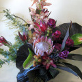 使用花材:キングプロテア、リュウガデンドロン、アンスリュウム、赤バラなど