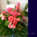 使用花材:リューカデンドロン・プロテアレッドセンセーション・薔薇・ヒペリカムなど