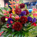 使用花材:プロテア、ヘルコニア、黒蝶ダリア、グロリオサなど