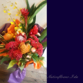 プロテア、ピンクッション、ジンジャー、ケイトウなど、トロピカルなイメージを盛り込んだ花束です。