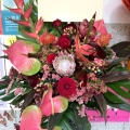 使用花材:プロテア、アンスリウム、ダリア、ピンクッション、ヘリコニアなど