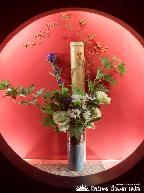 和食店の壁面ディスプレイコーナーの生け込み花♪ 赤い背景に映えるよう、美しいシルエットを作る季節のお花でアレンジ。 ★花材:トルコギキョウ、リンドウ、など
