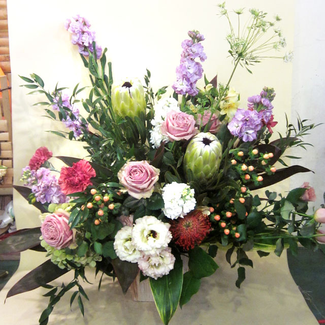 使用花材:プロテア、ピンクッション、ヒペリカム、バラなど